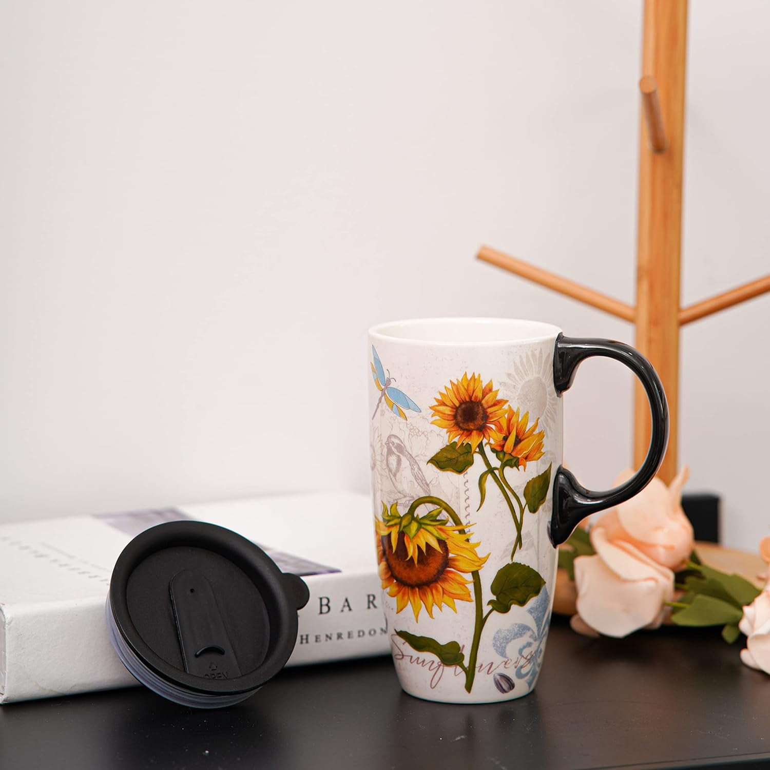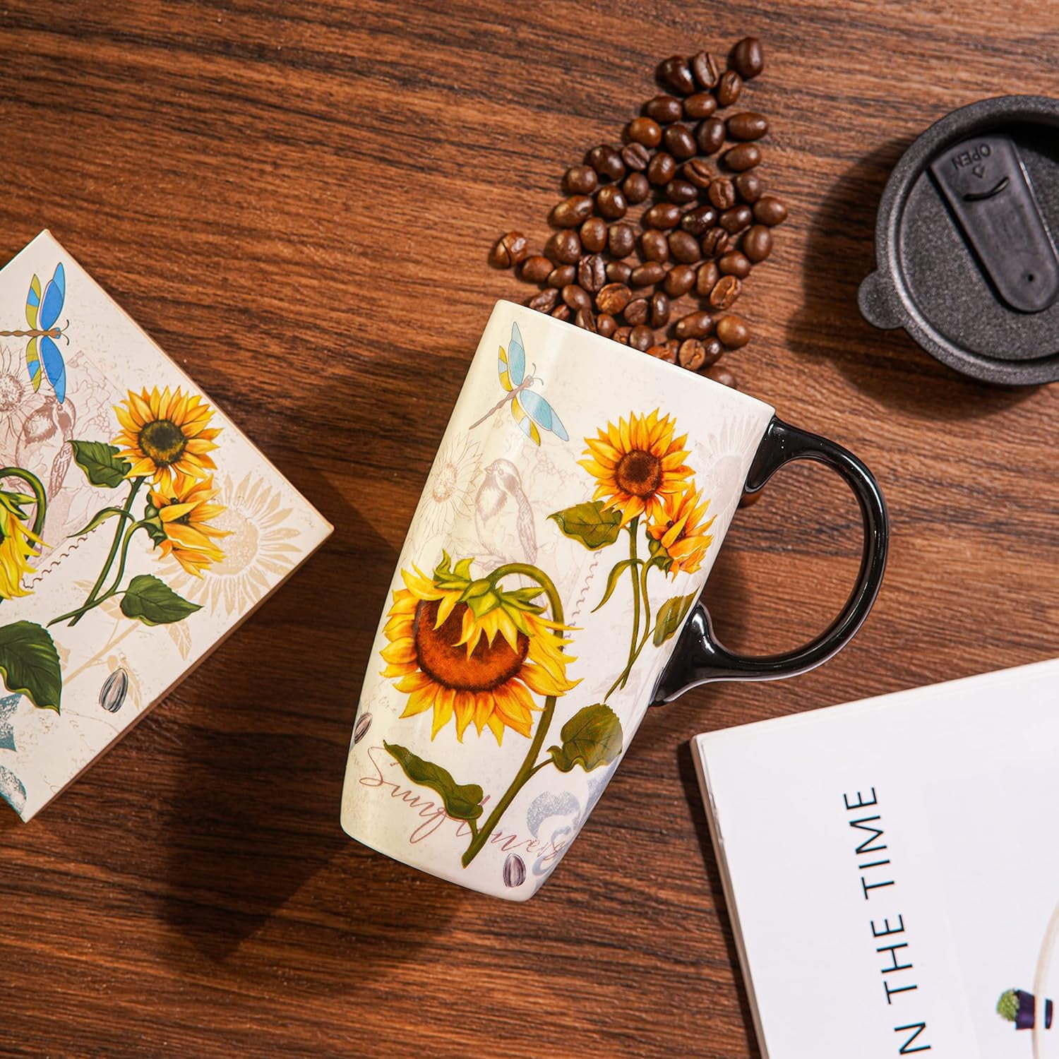 Topadorn Ceramic Mug Sunflower Coffee Cup with Gift Box Latte Mug with Lid, 17 oz Sunflower and Dragonfly